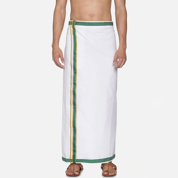 White solid mid-rise dhoti with green border, secured with a velcro closure, has 1 pocket